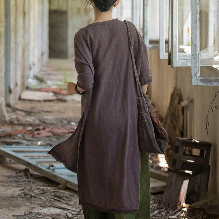 Buddha Stones Mid Length Dress Ramie Linen Half Sleeve Split Hem Top T-Shirt - Purple(Bust 124cm/Shoulder 60cm/Length 101-108cm)(Dress Only) - image 15