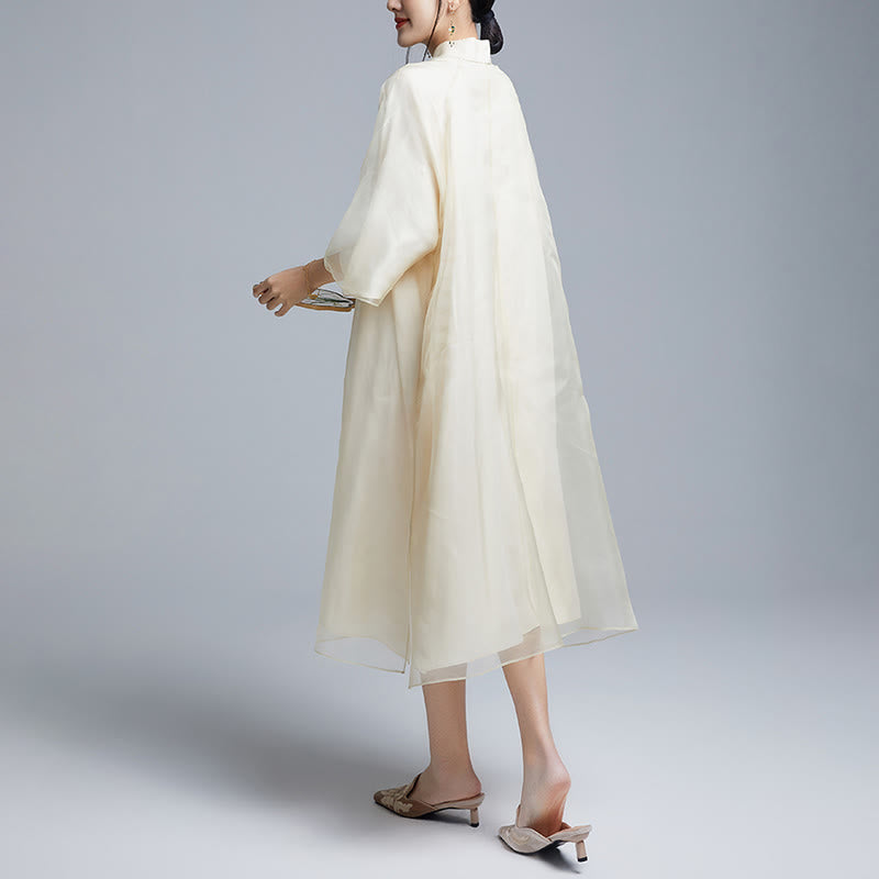 Buddha Stones 100% Mulberry Silk 6 Momme Dress Vintage Flower Butterfly Embroidery Qipao Dress Women's Cheongsam Dress - Beige - US8-10,UK/AU12-14,EU40-42 (XL) - image 0