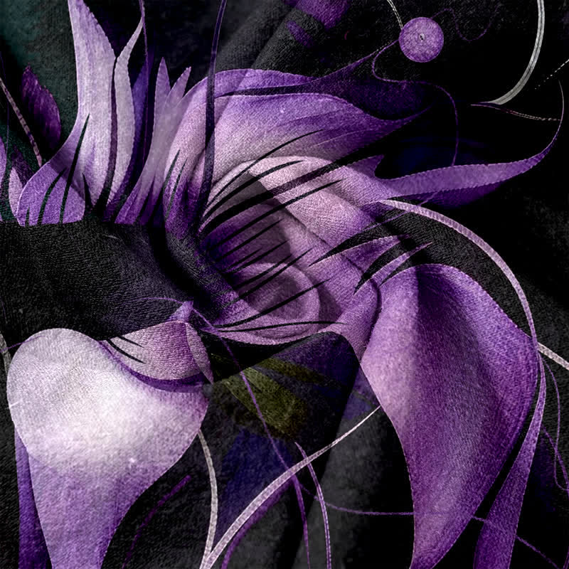- Design: The purple lotus motif evokes purity, renewal, and spiritual calm. Large florals placed on the hem and sides emphasize movement and a relaxed bohemian silhouette. Deep background with bright purple creates striking contrast and an artistic, mystical tone.