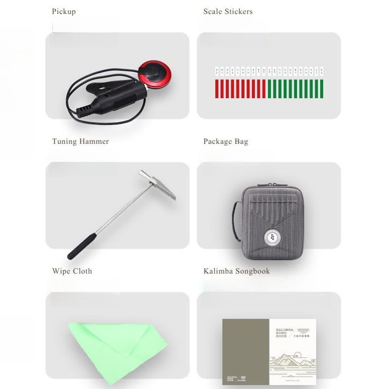 • Package Included: Kalimba*1, Kalimba Songbook*1, Tuning Hammer*1, Note Sticker*1, Cleaning Cloth*1, Storage Bag*1