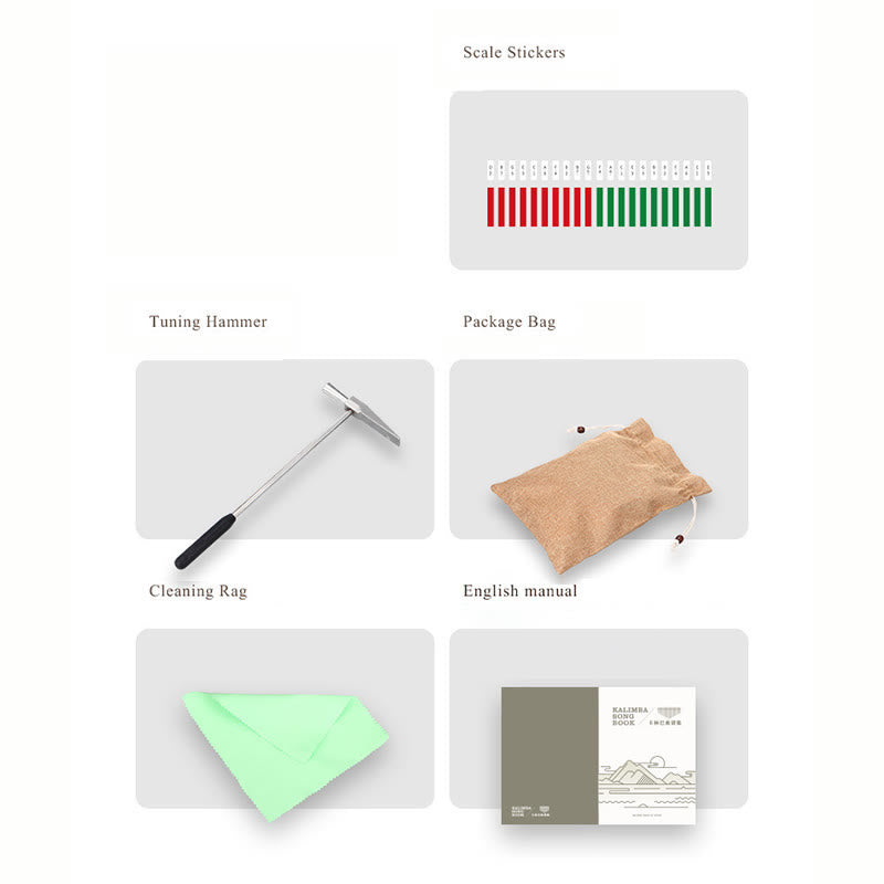 - Package Included: Kalimba*1, Kalimba Songbook*1, Tuning Hammer*1, Note Sticker*1, Cleaning Cloth*1, Storage Bag*1