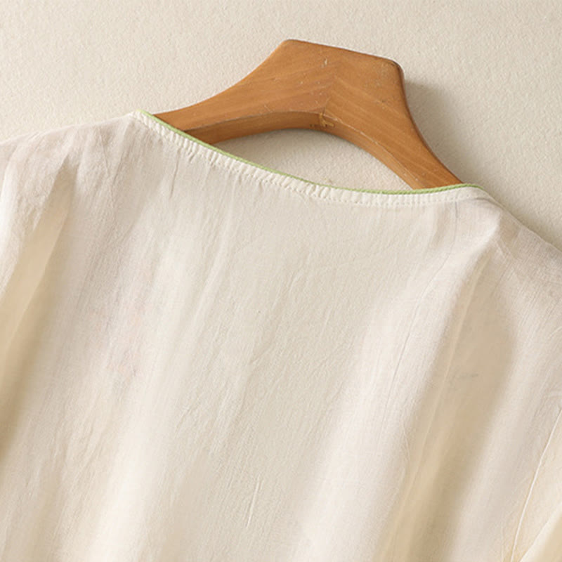 Buddha Stones Embroidery Flower Hem Slit Design Half Sleeve Cotton Linen Zen Midi Dress - image 17