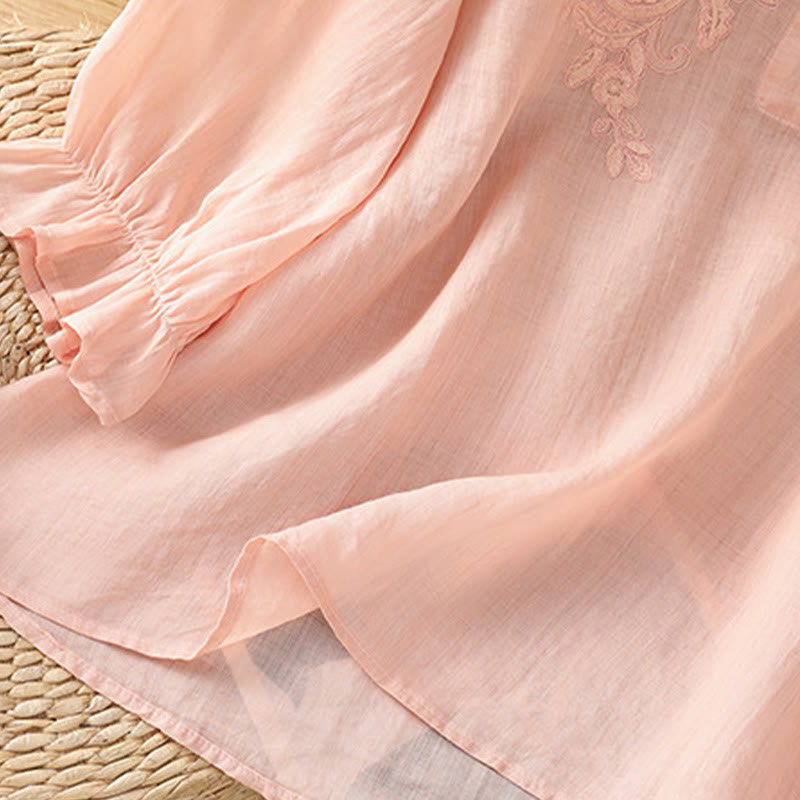 Buddha Stones Flower Vines Embroidery Button Crew Neck Three Quarter Sleeve Women's Cotton Shirt - LightPink - US12,UK/AU16,EU44 (2XL) - image 18