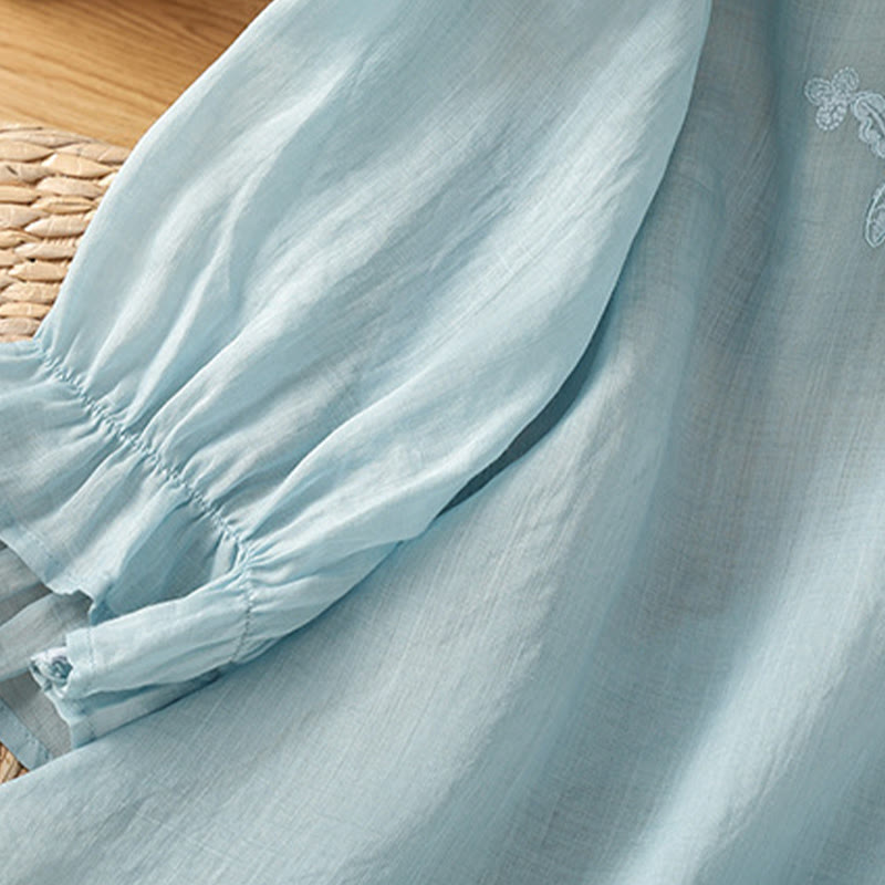 Buddha Stones Flower Vines Embroidery Button Crew Neck Three Quarter Sleeve Women's Cotton Shirt - LightBlue - US12,UK/AU16,EU44 (2XL) - image 26