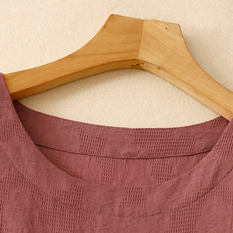 Buddha Stones Summer Jacquard Plain Elastic Cuff Design Crew Neck Short Sleeve Cotton Midi Dress