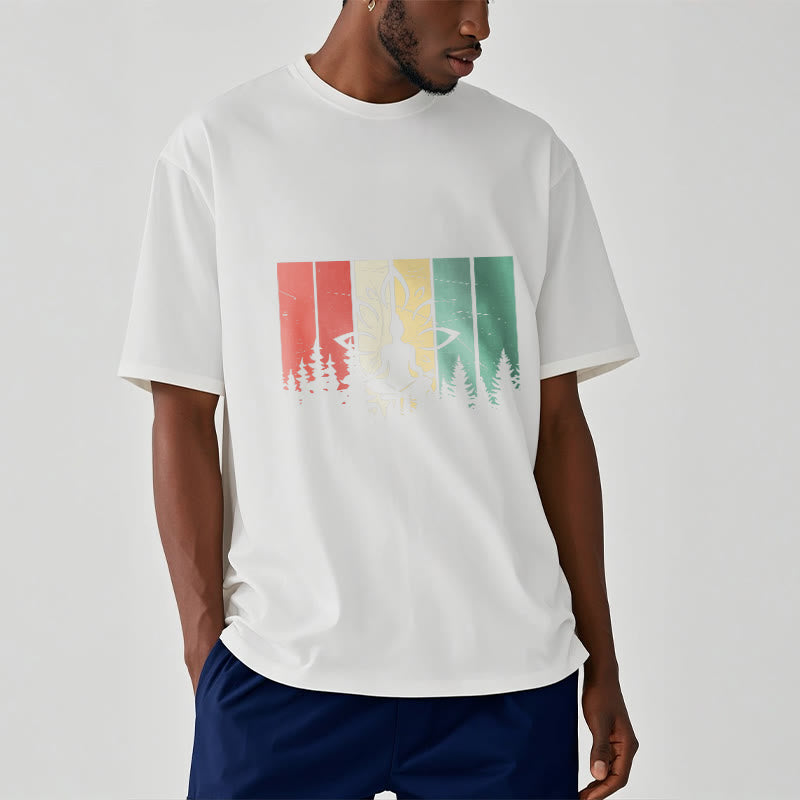 - DESIGN INSPIRATION:This T-shirt design features a silhouette of a statue meditating in a lotus position against a backdrop of vertical stripes in red, yellow, and green colors. Above the figure, there's a stylized lotus flower with multiple petals. The forest scene at the bottom adds a natural element to the design. The overall composition symbolizes inner peace, focus, and self-reflection, embodying themes of spirituality and harmony with nature.