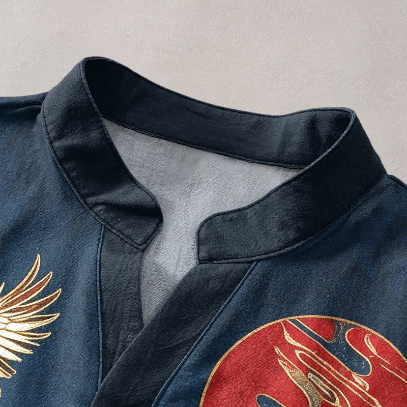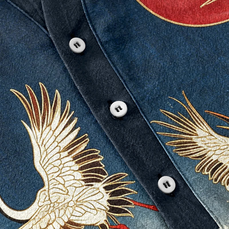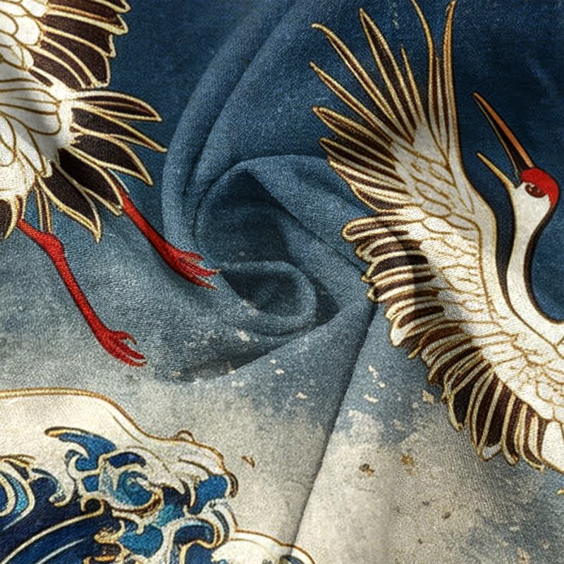 - Design: The crane, wave, and celestial motifs blend traditional East Asian symbolism, representing longevity, resilience, and the dynamic flow of life. The stylized waves evoke strength and adaptability, while cranes signify good fortune and transcendence, and the circular celestial element embodies wholeness and harmony. Together, the design captures a bold, timeless spirit of balance between nature’s power and graceful elevation.