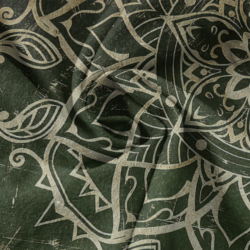 Design:Repeating lotus mandala motifs draw on traditional Eastern spiritual symbolism: the mandala embodies cosmic harmony and completeness, while the lotus represents purity and enlightenment. The vintage distressed green base and off-white pattern deliver a bohemian, spiritual-inspired harmony and rich decorative texture.