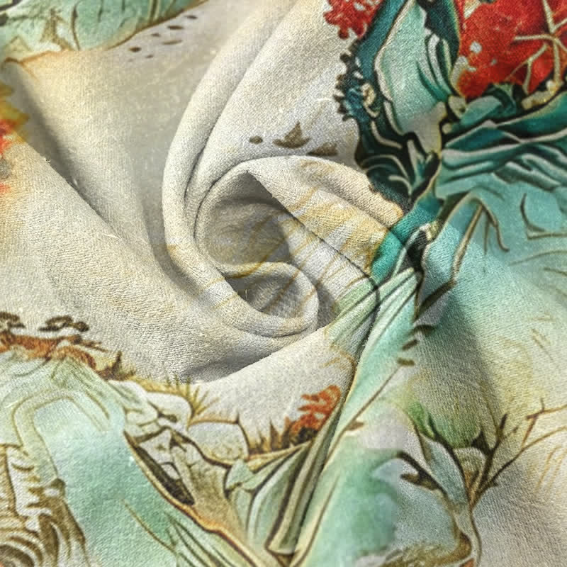 - Design: The print uses traditional Chinese landscape motifs—pagodas, mountains, waves, and floral clusters—to reference cultural heritage. Turquoise and warm red accents provide contrast and guide the eye across the full-coverage design. The overall effect evokes tranquility and a relaxed, summery aesthetic that blends oriental art with contemporary casual shirting.