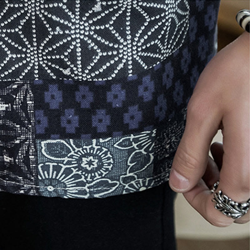 Buddha Stones Ethnic Printing Patchwork Half Sleeve Open Front Jacket Cotton Linen Men's Kimono