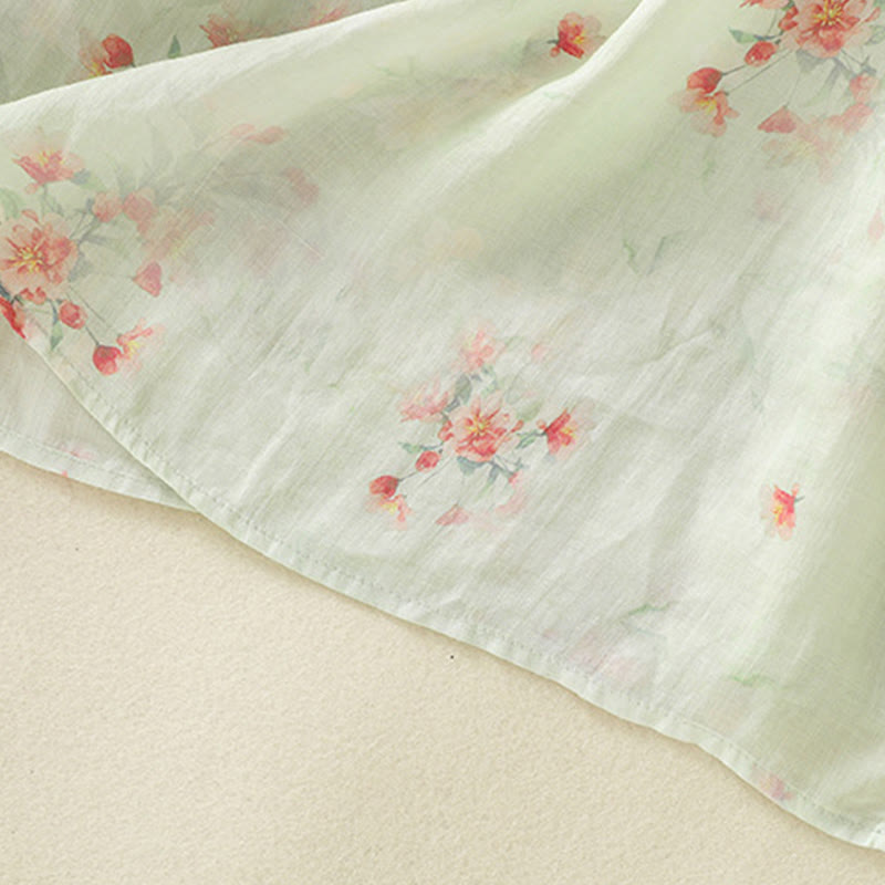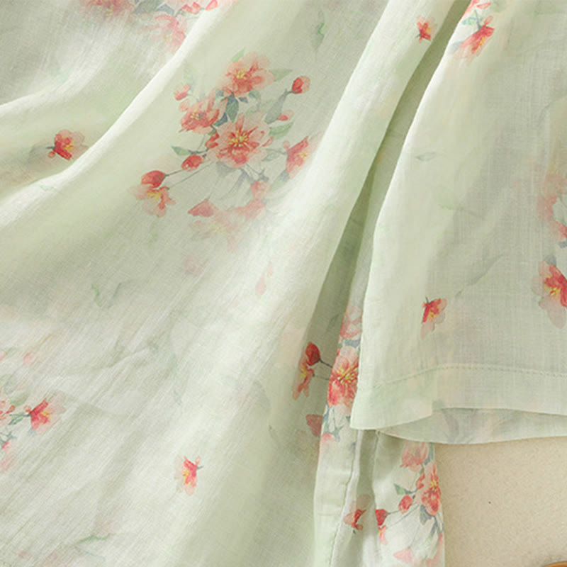 Buddha Stones Plant Printed Crew Neck Frog Button Design Women's Polyester Three Quarter Sleeve Shirt