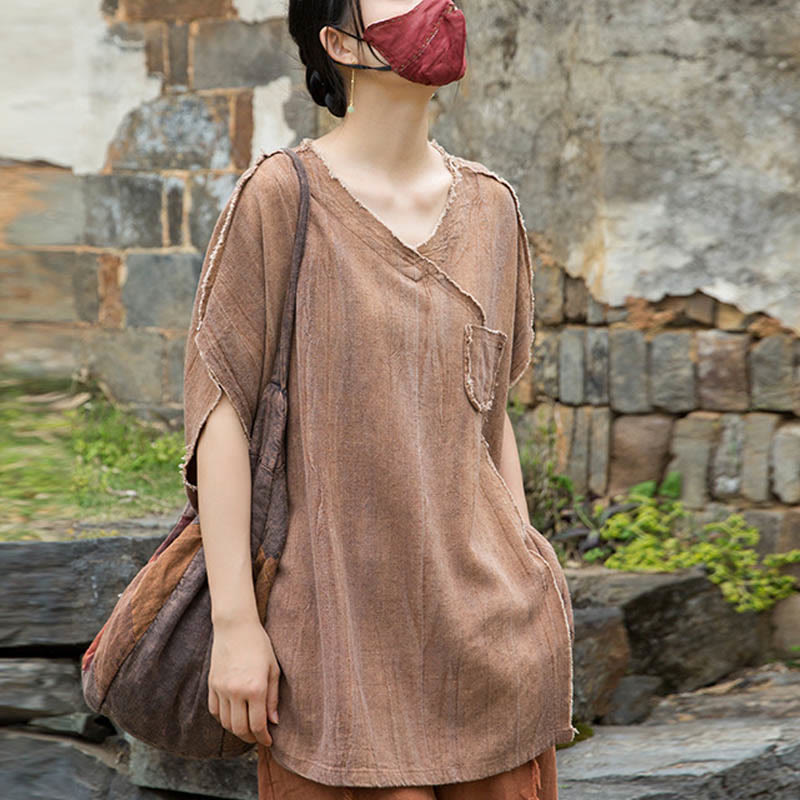 Buddha Stones Summer Tie-dye Linen V-Neck Short Sleeve Women's T-shirts