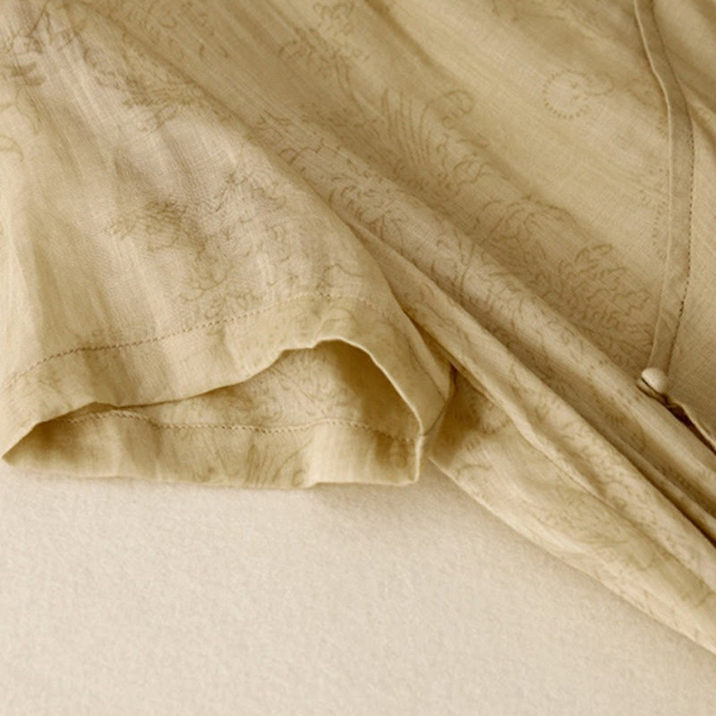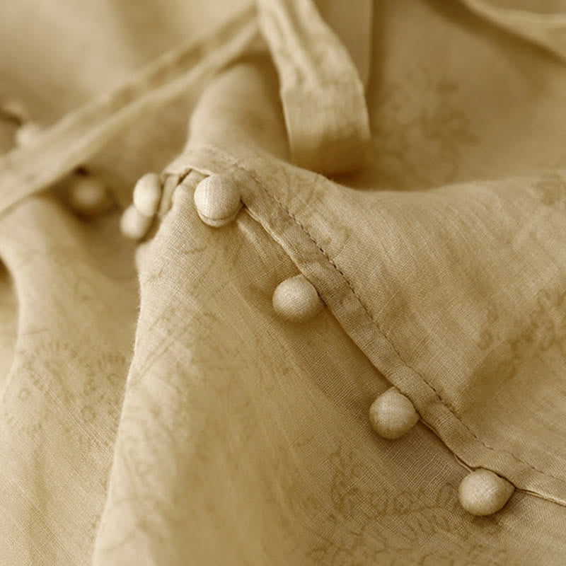 Buddha Stones Summer V-Neck Lace-up Short Sleeve Cotton Linen Women's Midi Dress With Pockets