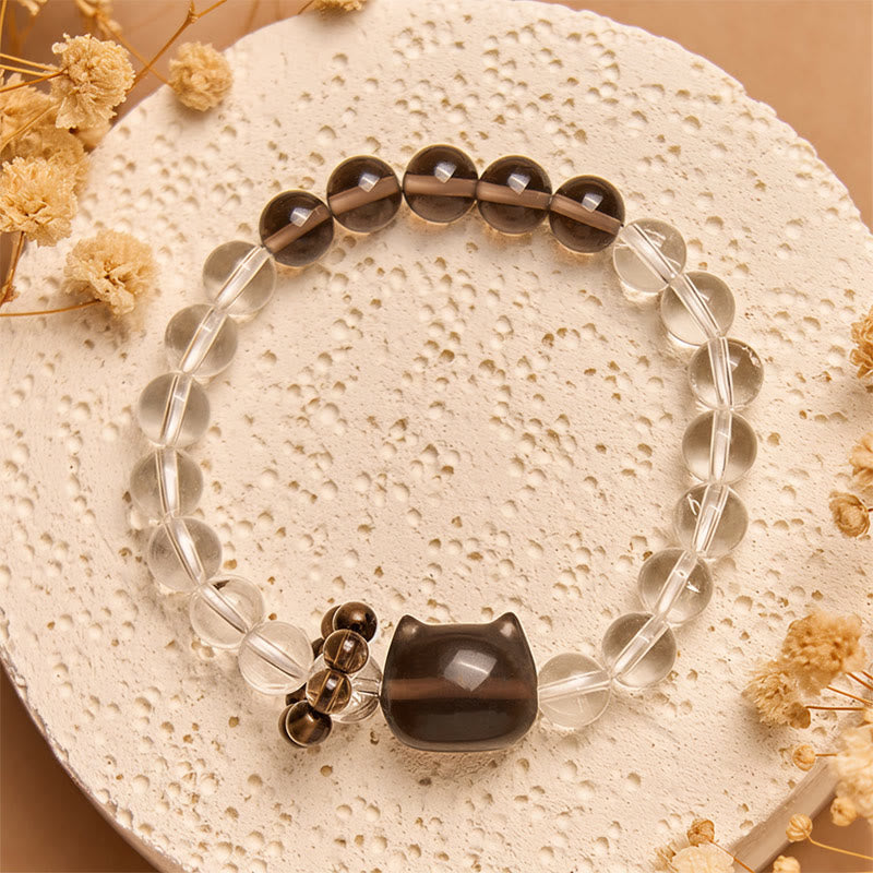 Buddha Stones Japanese Bobtail Cat Natural White Crystal Smoky Quartz Protection Bracelet