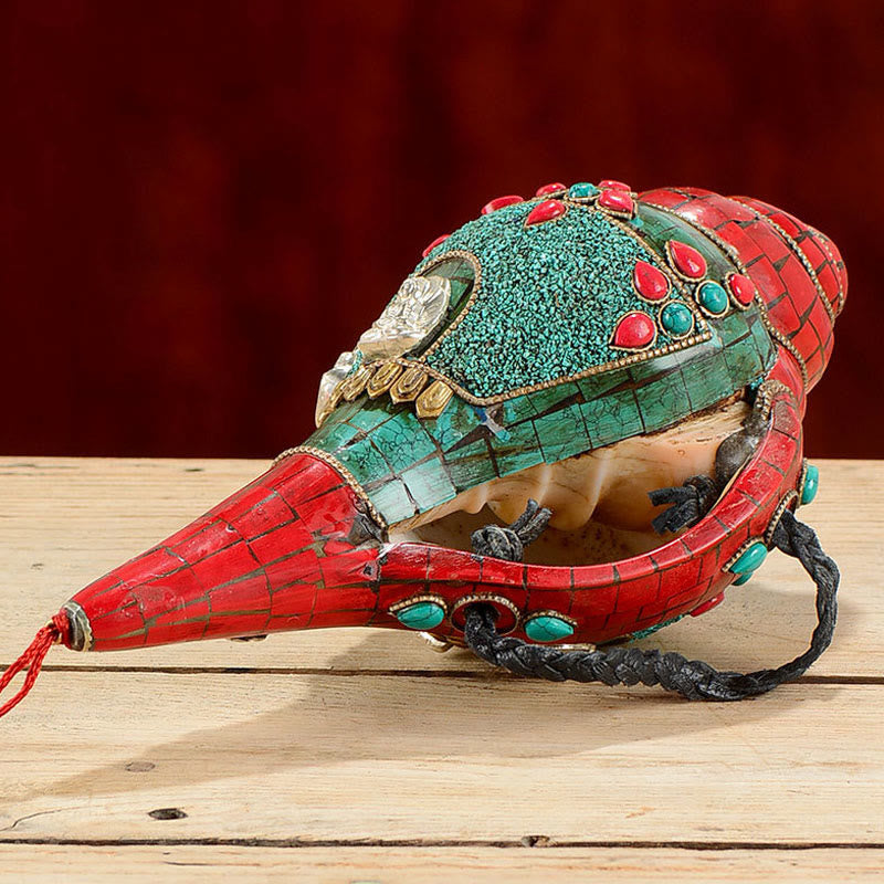 Tibetan Handmade Shankha Om Mani Padme Hum Buddha Avalokitesvara Turquoise Conch Shell Positive Decoration - Red Turquoise 24*11cm - image 1