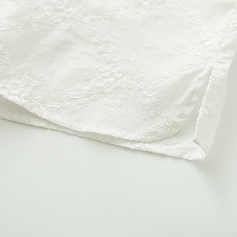 Buddha Stones Fall Ruffled Collar Embroidered Relief Flower Buttons Women's Cotton Long Sleeve Shirt