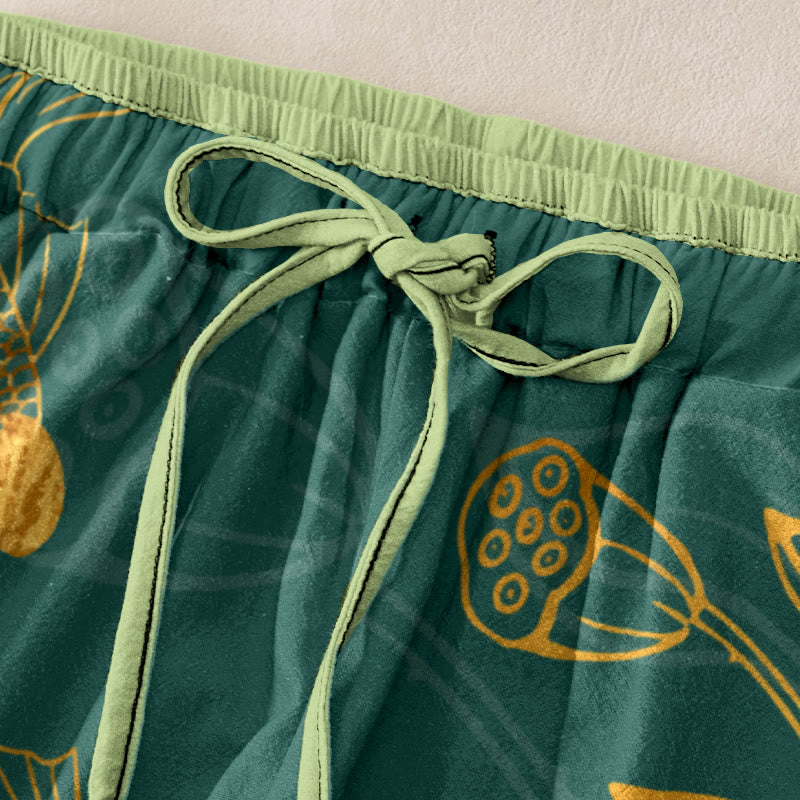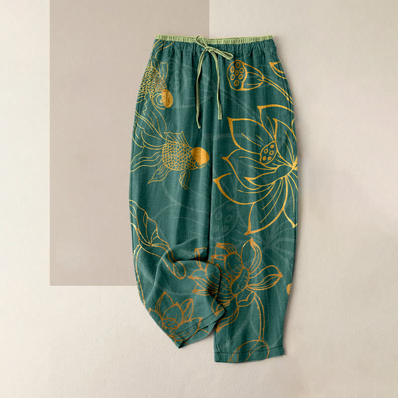 - Design: This harem pants design features koi fish, lotus flowers, and leaves. The koi swims lightly in the soft curves, showing a smooth posture, while the lotus adds a tranquil and natural atmosphere with delicate texture details. The overall pattern presents a tranquil scene, cleverly combining water, plants and elegant dynamic elements.