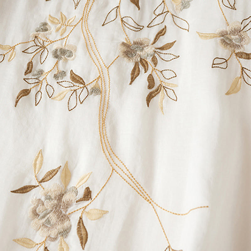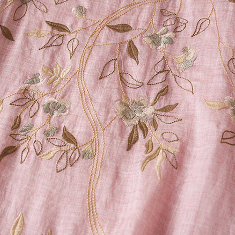 Buddha Stones Embroidered Leaf Crew Neck Half Sleeve Fiber Midi Dress