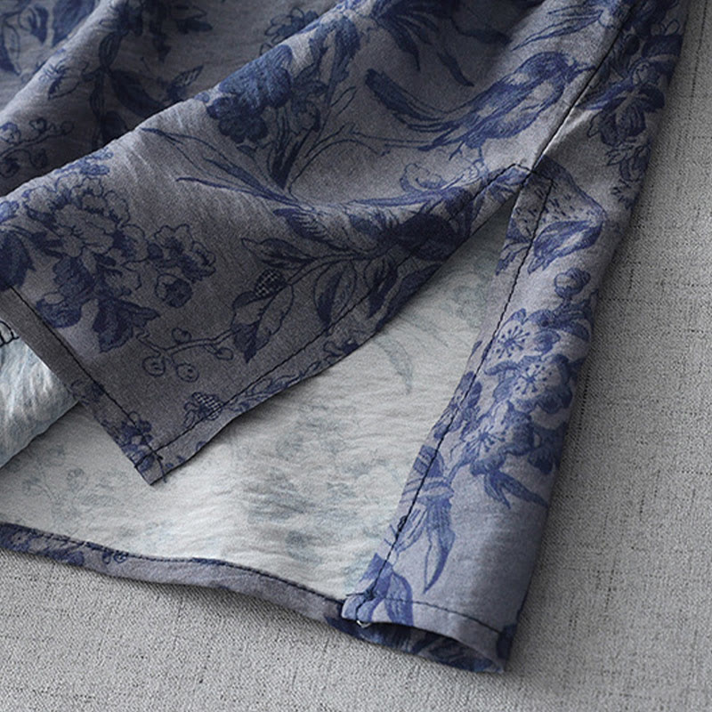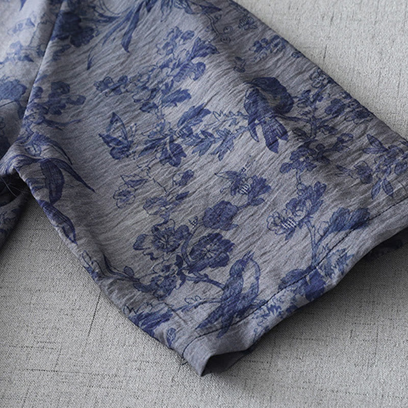 Buddha Stones Flower Leaf Print Frog-Button Half Sleeve Mandarin Collar Cotton Midi Dress