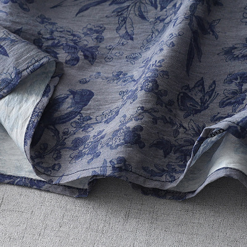 Buddha Stones Flower Leaf Print Frog-Button Half Sleeve Mandarin Collar Cotton Midi Dress - RoyalBlue - US8-10,UK/AU12-14,EU40-42 (2XL) - image 0