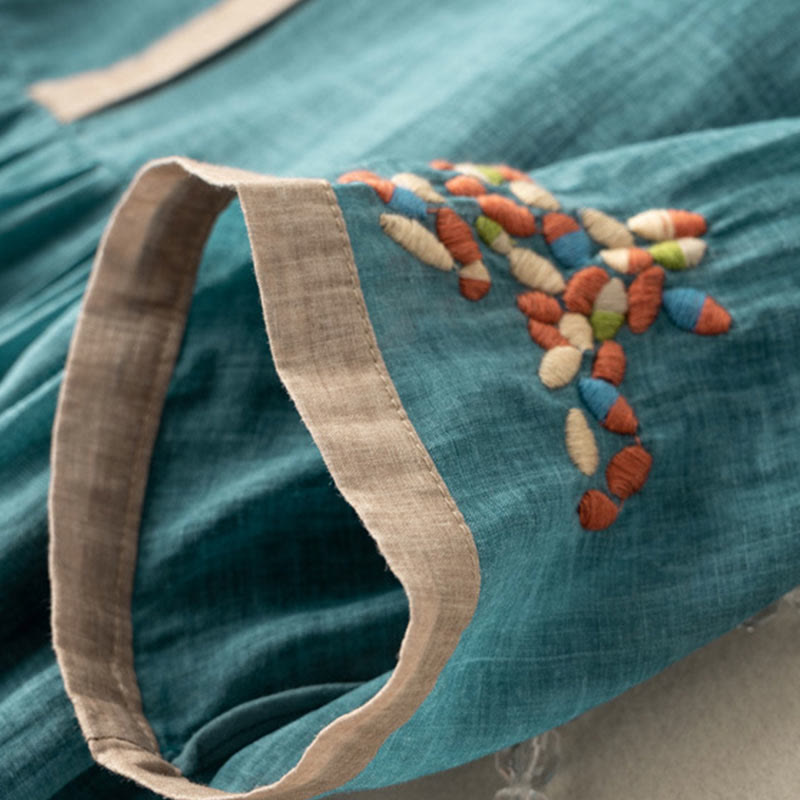 Buddha Stones Spring Ethnic Embroidery Half Sleeve Cotton Linen Women's Midi Dress - Teal - US8-10,UK/AU12-14,EU40-42 (2XL) - image 6