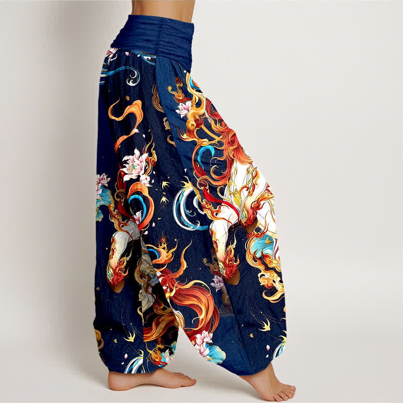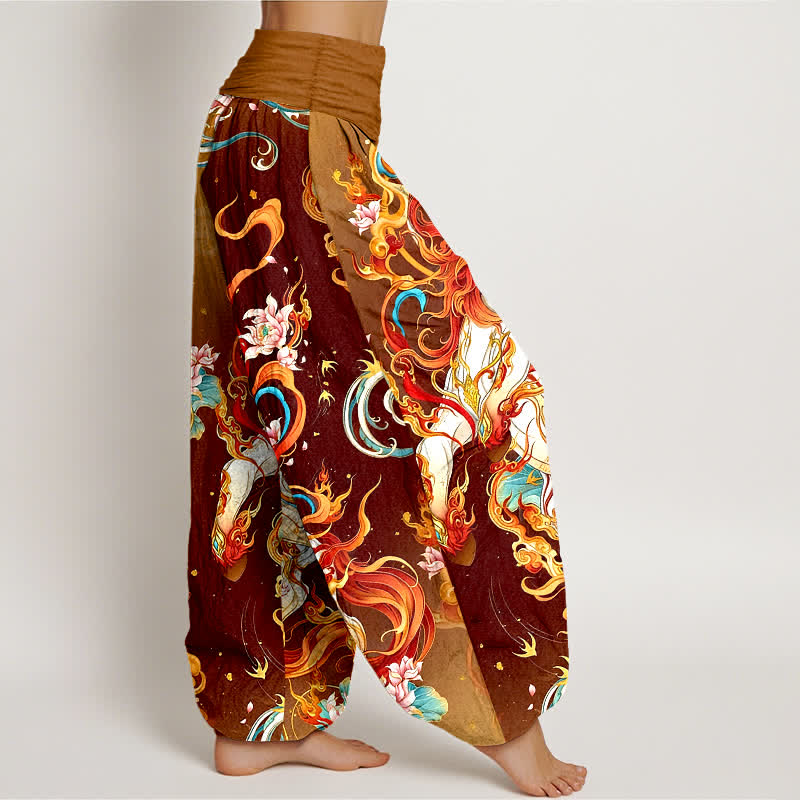 - Design: Depicts a mythical phoenix and flame motifs symbolizing rebirth, vitality and transformation. Bold, high-contrast printing creates a dramatic focal point that emphasizes movement and flow in the harem silhouette. Rooted in folk and bohemian aesthetics, the design adds cultural artistry and visual drama to casual and performance settings.