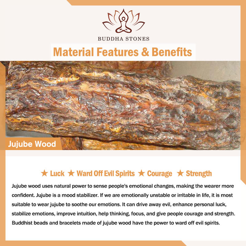 Jujube wood uses natural power to sense people's emotional changes, making the wearer more confident. Jujube is a mood stabilizer. If we are emotionally unstable or irritable in life, it is most suitable to wear jujube to soothe our emotions. It can drive away evil, enhance personal luck, stabilize emotions, improve intuition, help thinking, focus, and give people courage and strength. Buddhist beads and bracelets made of jujube wood have the power to ward off evil spirits.